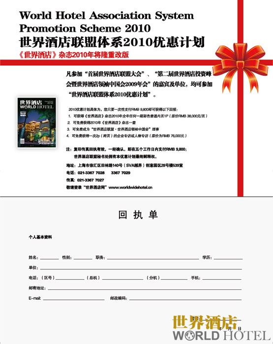 2.可免費(fèi)獲得2010年《世界酒店》雜志一套