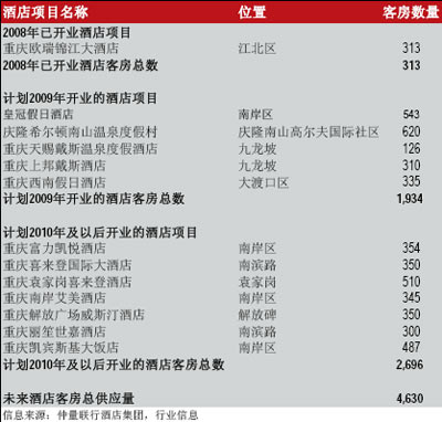 重慶的酒店市場受金融危機影響小于很多其他國內城市。盡管酒店開發保持強勁,由于新供應的地理分布較為分散,為開發區域中的現有酒店仍將吸納一定量的被抑制需求,新酒店供應預期將有助于提高整體的產品和服務品質,并可能因此推高酒店房價。