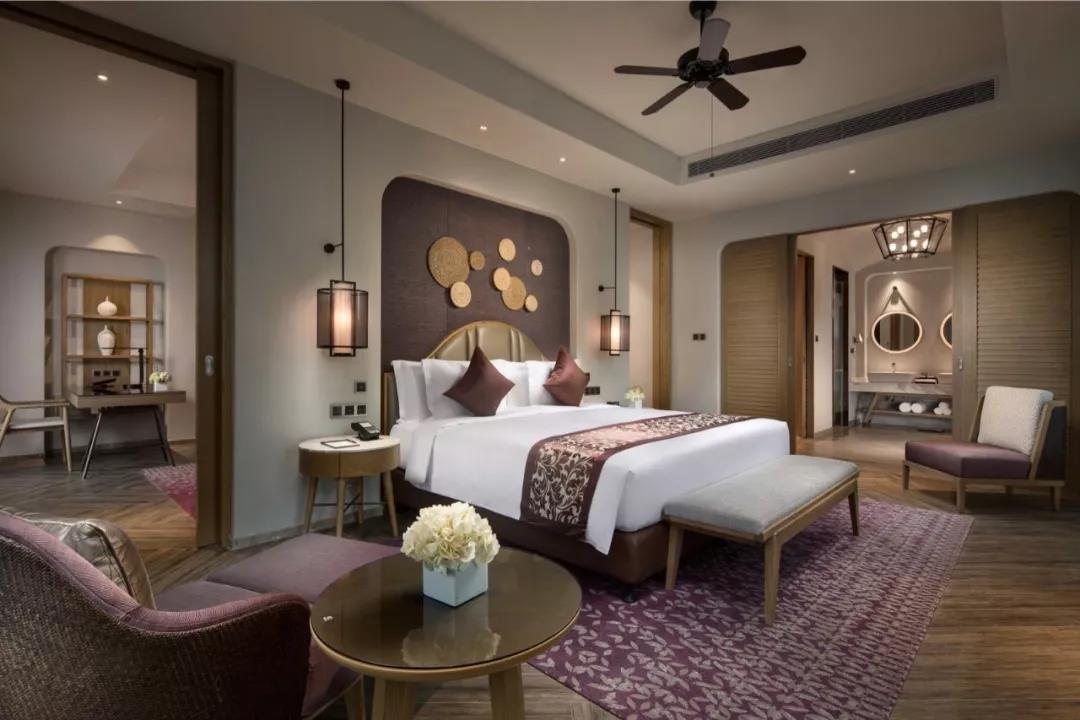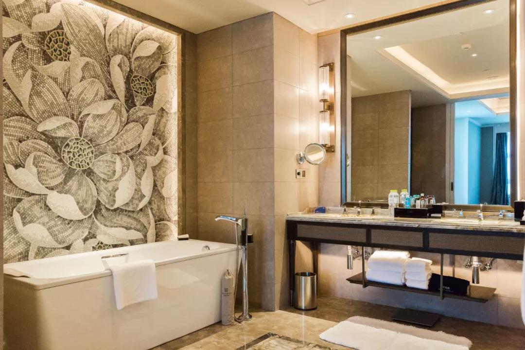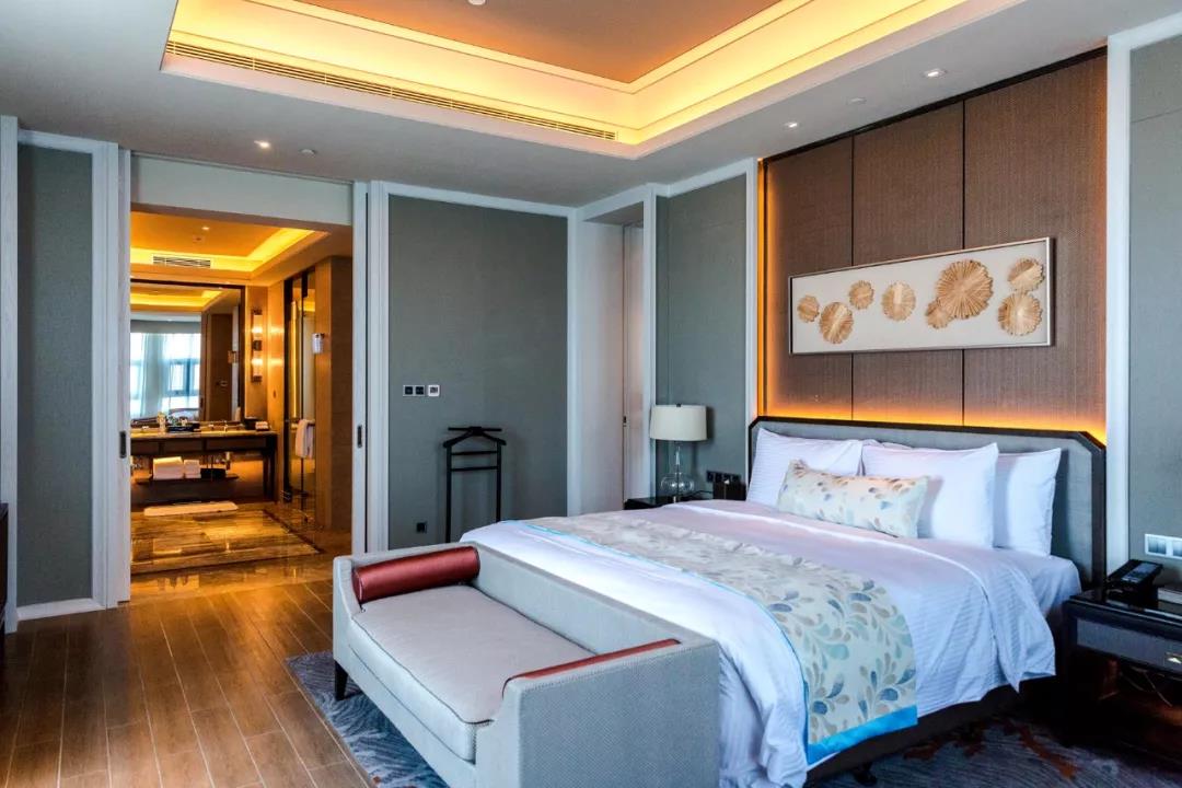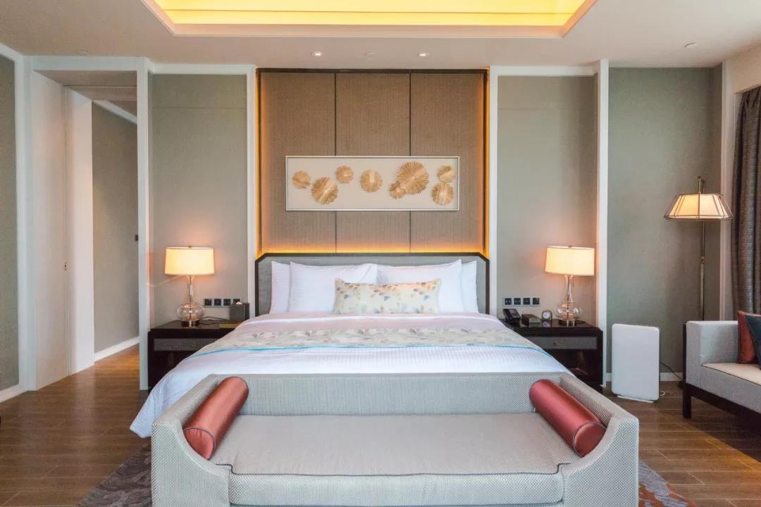 酒店擁有324間豪華舒適全海景客房及套房,客房面積從50平方米起,和萬達文華一樣,這里的客房同樣擁有步入式私家陽臺,可欣賞歐式庭院景觀或是迷人海景。在設計元素上,更多突出了“花”的主題,簡約又不失精致。開放式的衛浴空間令人耳目一新,度假感十足。