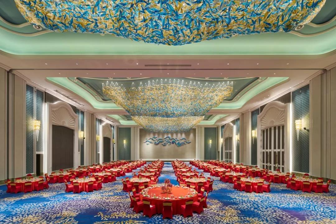 不論是商務會議,社交活動以及婚禮慶典,星光島會展中心都是一種優雅與格調的彰顯。獨立的星光島會展中心位于青島東方影都萬達文華酒店與萬達嘉華酒店中間位置,近5,000平方米。以碧海藍天為主題的2,000平方米可自由分割的無柱大宴會廳,挑高11.7米,配備200平方米高清LED 屏,可供車輛進出的專屬通道,由數萬海鳥飛翔在天空與大海之間造型的水晶燈片組成,配以珊瑚圖案的藍色地毯,渲染出壯闊、秀麗的青島海濱美景。1,500平方米的宴會廳前廊,天花板通過筆觸極力表現海底的絢爛世界,十二星座點綴其中,既是海底又是星空。另有10間宴會廳和多功能廳及千人的戶外場地 ,盡其所能的滿足各式會議及宴會需求。