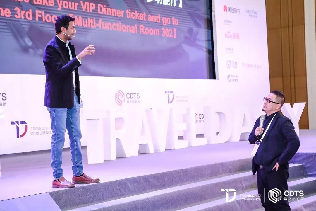 OYO酒店創始人兼CEO李泰熙(左)在2018環球旅訊峰會演講