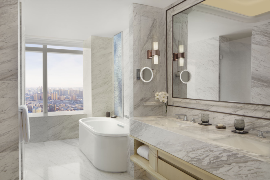 麗思卡爾頓套房中,Fromental手工制作的墻紙融合了多種設計元素和材料,包括絲綢、刺繡和手工繪畫,描繪出以俄羅斯與中國傳統瓷器為靈感而創作的精美紋飾,仿佛成為一件獨特的藝術品。麗思卡爾頓套房和行政套房中,客廳與浴室中使用的多種大理石材也完美契合了酒店的主題設計元素。