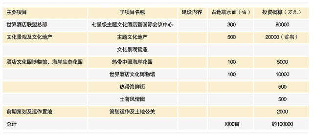 熱帶中國海岸項目及其配套項目創意獨特、規模宏大、特色鮮明、功能完善,由投資運作,世界酒店聯盟大會會址項目計劃總投資30億元人民幣左右,第一階段投資總額10億元人民幣,占地面積1000畝以上(不含沙灘和海域租用面積),首期用地500畝,整個項目按國際一流概念進行規劃設計,至少在50年內屬于國際一流水平。