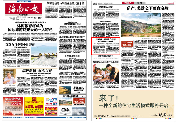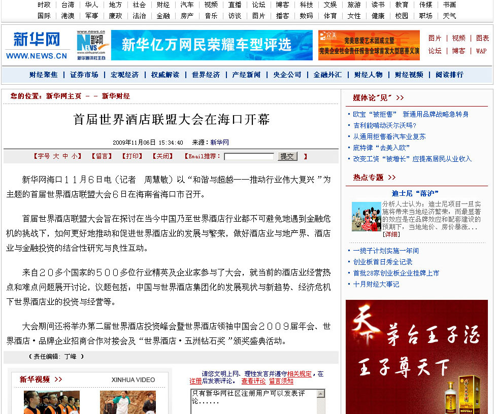 11月7日,由海口市人民政府、世界酒店聯(lián)盟、世界華商聯(lián)合會、美國亞洲協(xié)會、旅游衛(wèi)視共同主辦,由世界旅游組織亞太部及多個國家的國家旅游局支持,并聯(lián)合中外政府部門、權(quán)威機(jī)構(gòu)、大型企業(yè)集團(tuán)和著名傳媒機(jī)構(gòu)積極參與的“首屆世界酒店聯(lián)盟大會·第二屆世界酒店投資峰會暨世界酒店領(lǐng)袖中國會2009年會”在中國海口圓滿落下帷幕。二十多個國家的500多位行業(yè)精英和企業(yè)家與50多家主流媒體負(fù)責(zé)人和代表共同見證此項行業(yè)盛會。電視報紙網(wǎng)絡(luò)等媒體廣泛報道了此次盛會,以下是部分媒體報道鏈接: