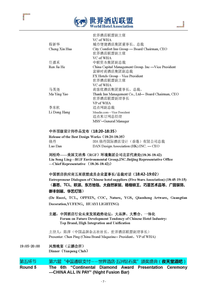 中國酒店供應(yīng)商五星聯(lián)盟自成立以來即同世界酒店聯(lián)盟達(dá)成全面戰(zhàn)略合作關(guān)系。2014年,中國酒店供應(yīng)商五星聯(lián)盟將再次特別協(xié)力“第七屆世界酒店論壇(亞龍灣鳥巢峰會(huì))”暨“第六屆世界酒店·五洲鉆石獎(jiǎng)?lì)C獎(jiǎng)盛典”活動(dòng),并派出12人的企業(yè)家代表團(tuán)參加此次“論壇峰會(huì)”。