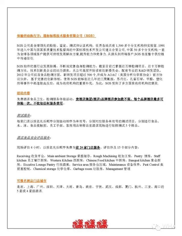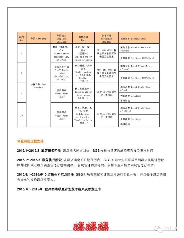世界酒店聯盟在2015年將開展酒店食品、衛生檢測服務免費體驗活動,具體內容如下: