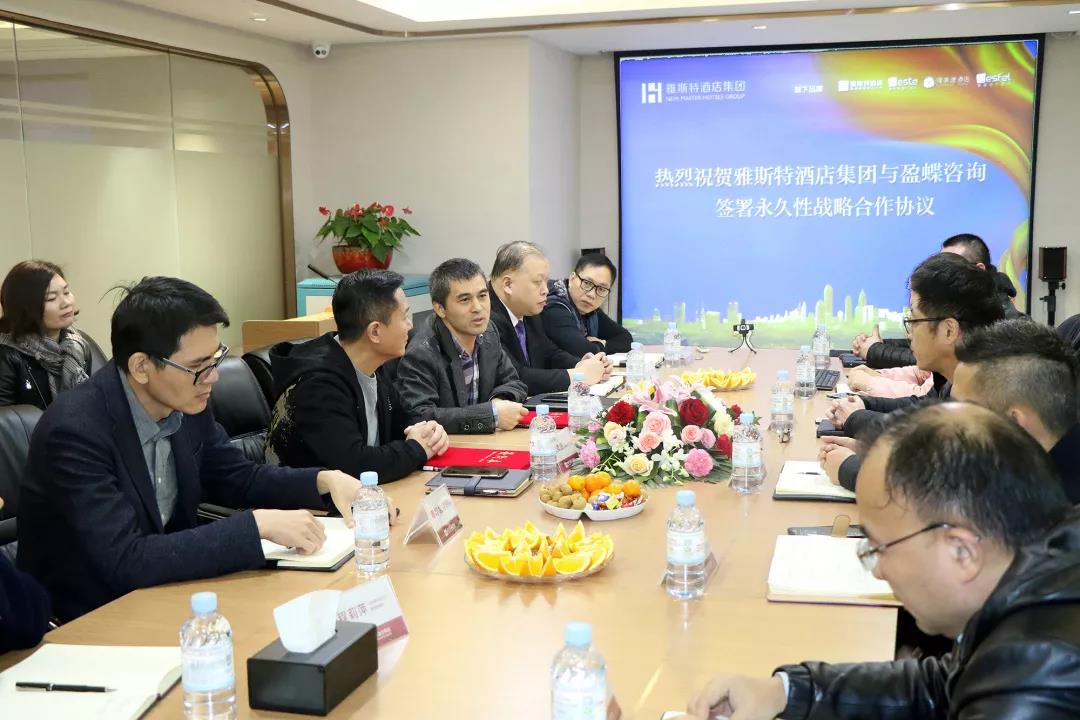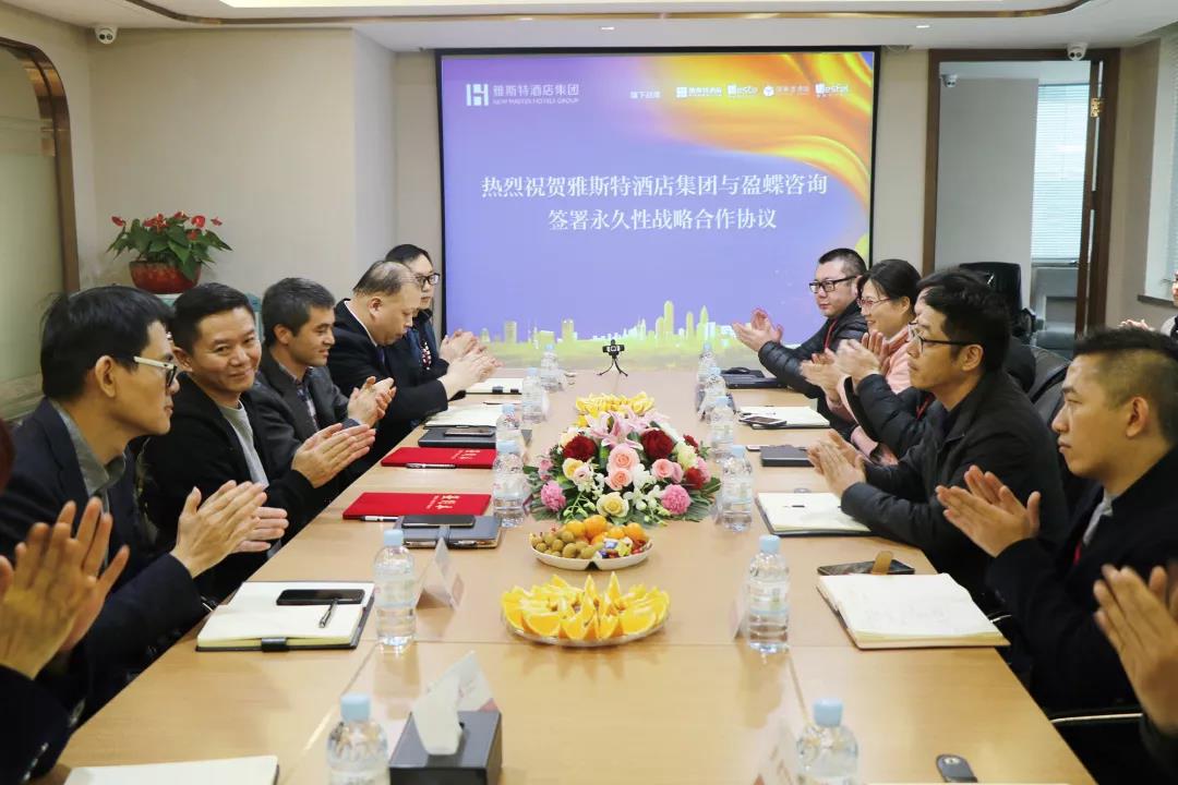 2018年12月27日下午3點整,在雅斯特酒店集團,雅斯特酒店集團創始人/CEO胡競選先生與盈蝶咨詢創始人胡升陽先生簽署了永久性戰略合作協議,雅斯特酒店集團全體高管成員一同見證了協議簽訂儀式。
