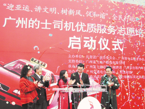 為創建全國文明城市、迎接廣州2010年亞運會,由共青團廣州市委、廣州青年志愿者協會主辦、信息時報協辦的“迎亞運、講文明、樹新風、促和諧”全民行動之“廣州的士司機優質服務志愿培訓計劃”昨日正式啟動。50多名出租車司機代表和上百名志愿者參加了啟動儀式,并在儀式結束后接受了由廣州富力麗思卡爾頓酒店總經理龍嘉德先生主講的第一場培訓課。