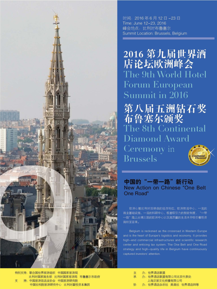 With the joint support from CNTA, Belgian National Ministry of Commerce, Belgian National Tourism Administration, Brussels Municipal Government, the 9th World Hotel Forum European Summit is taking place in Brussels in 2016. The summit is reckoned as a convergence of delegates and mainstream media journalists from UNWTO, EU, Belgian National Tourism Administration, Brussels Municipal Government, CTHA and famous enterprises from across the globe. The summit is sponsored by HOCA Capital and other groups and it is the embodiment of the initiative in "One Belt, One Road" strategy. An exclusive quota of 35-50 people is available for the summit and the total number of attending guests shall be confined within 150.