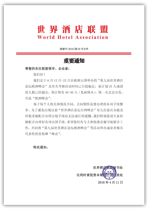 鑒于每個人的具體情況不同,且同期所需要辦理的各項手續繁多,為了避免出現以前“世界酒店論壇臺灣峰會”有幾位嘉賓未能及時穩妥地配合辦理出境手續而無法成行的遺憾,我們特別懇請大家積極配合辦理好各項出國手續,希望您們有專人和組委會秘書處聯合工作,共同將“第九屆世界酒店論壇歐洲峰會”等活動舉辦成業界極具代表性的里程碑“峰會”。