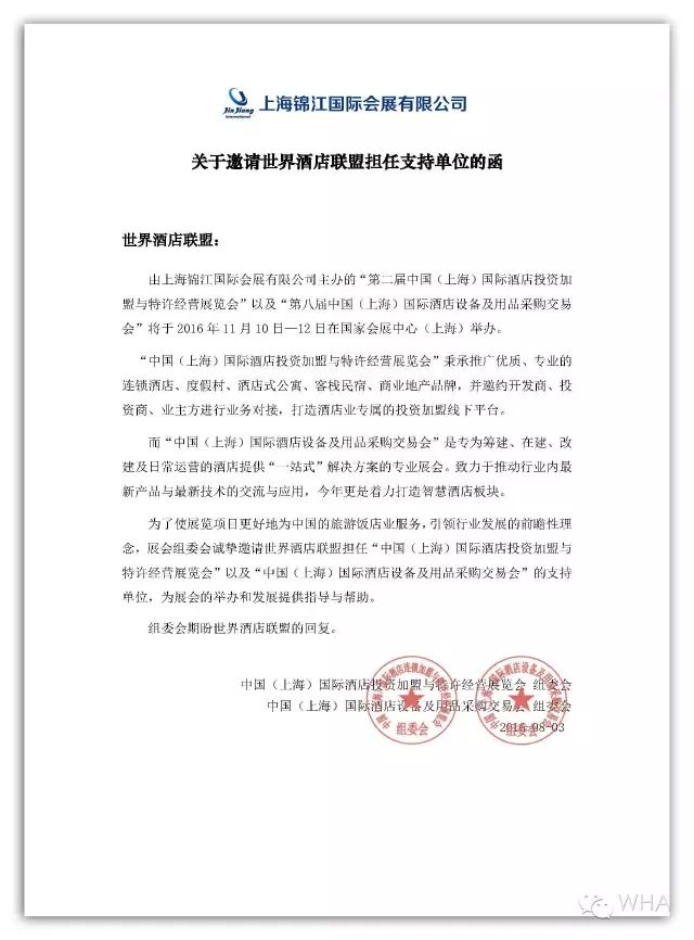 “第二屆中國(上海)國際酒店投資加盟與特許經營展覽會”和“第八屆中國(上海)國際酒店設備及用品采購交易會”將于2016年11月10日-12日在上海國家會展中心舉辦。日前,主辦方上海錦江國際會展有限公司特致函邀請世界酒店聯盟擔任該國際展會支持單位并為展會的舉辦和發展提供指導與幫助。