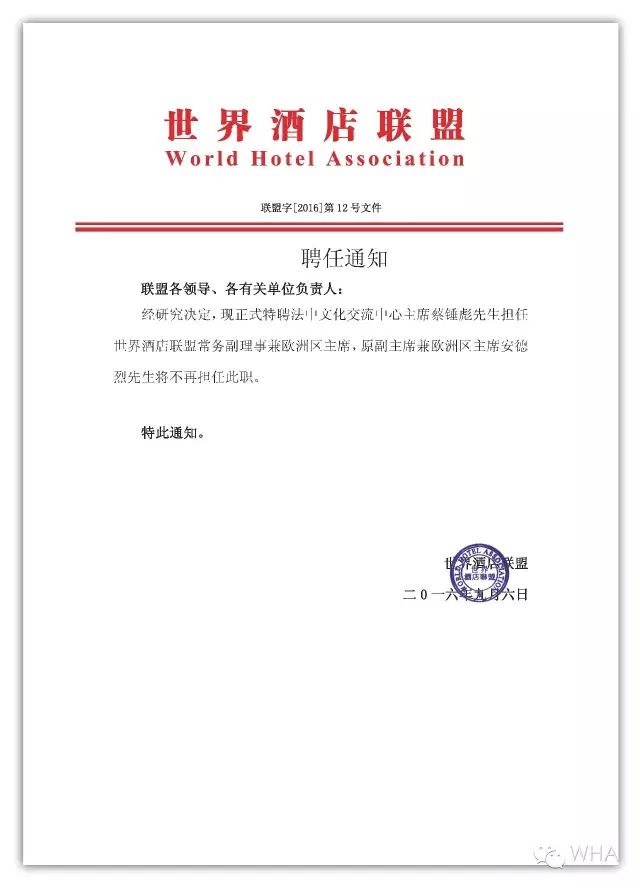 經(jīng)研究決定,現(xiàn)正式特聘法中文化交流中心主席蔡錘彪先生擔(dān)任世界酒店聯(lián)盟常務(wù)副理事兼歐洲區(qū)主席,原副主席兼歐洲區(qū)主席安德烈先生將不再擔(dān)任此職。