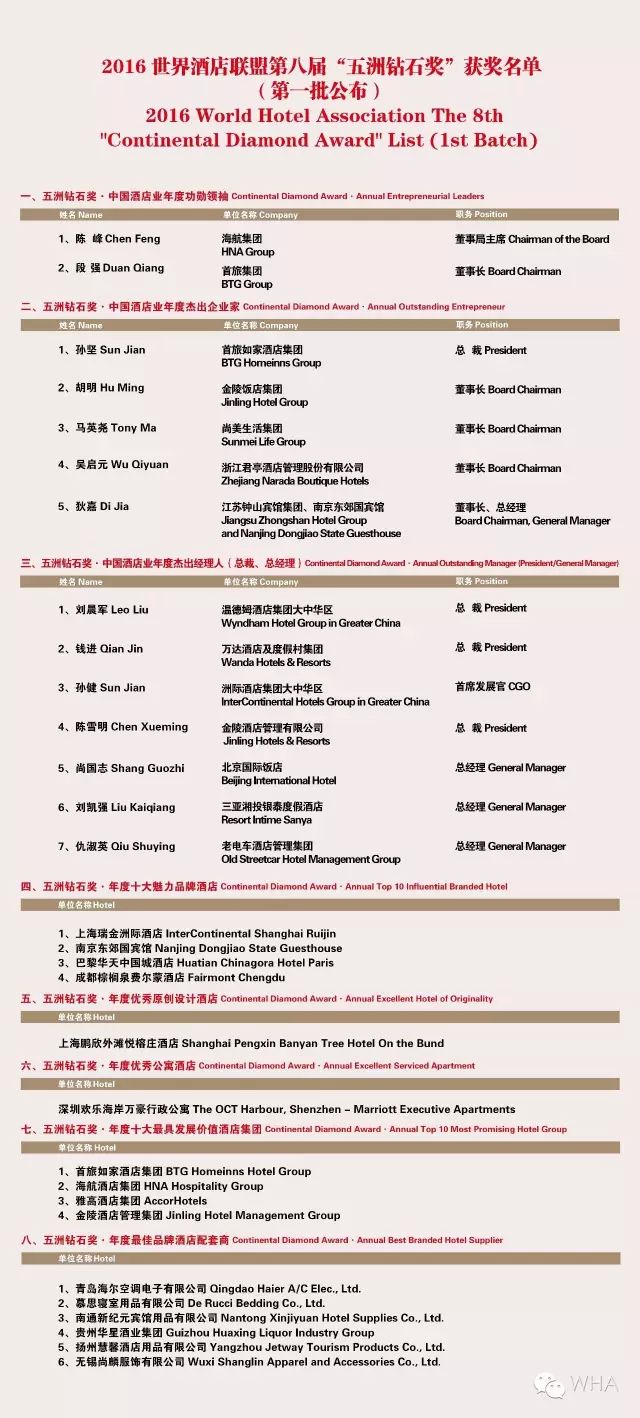 After strict evaluation based on “just, fair and open”, and inspection, selection and assessment by World Hotel Association for more than half a year, the association is now to release the first batch of winners’ list for the “8th Continental Diamond Award”, which will be issued on the “9th World Hotel Forum Pan Tourism Culture Industry Investment Cooperation Summit”, at home and abroad (the final list of award winners subject to the award ceremony). The “9th World Hotel Forum Pan Tourism Culture Industry Investment Cooperation Summit” will be held in Nanjing Dongjiao State Guesthouse, China on December 9-10th, 2016.
