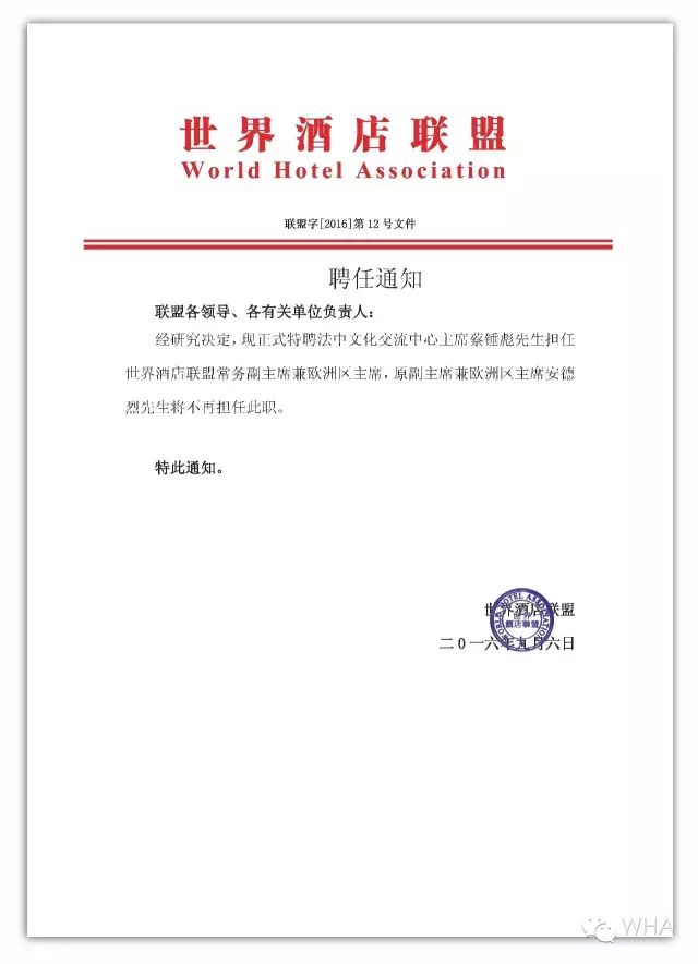 經研究決定,現正式特聘法中文化交流中心主席蔡錘彪先生擔任世界酒店聯盟常務副主席兼歐洲區主席,原副主席兼歐洲區主席安德烈先生將不再擔任此職。