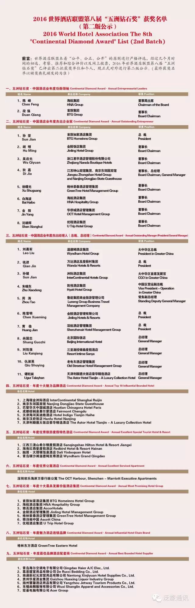 After strict evaluation based on “just, fair and open”, and inspection, selection and assessment by World Hotel Association for more than half a year, the association is now to release the second batch of winners’ list for the “8th Continental Diamond Award”, which will be issued on the “9th World Hotel Forum Pan Tourism Culture Industry Investment Cooperation Summit”, at home and abroad (the final list of award winners subject to the award ceremony). The “9th World Hotel Forum Pan Tourism Culture Industry Investment Cooperation Summit” will be held in Nanjing Dongjiao State Guesthouse, China on December 9-10th(register in Dec.8th), 2016.