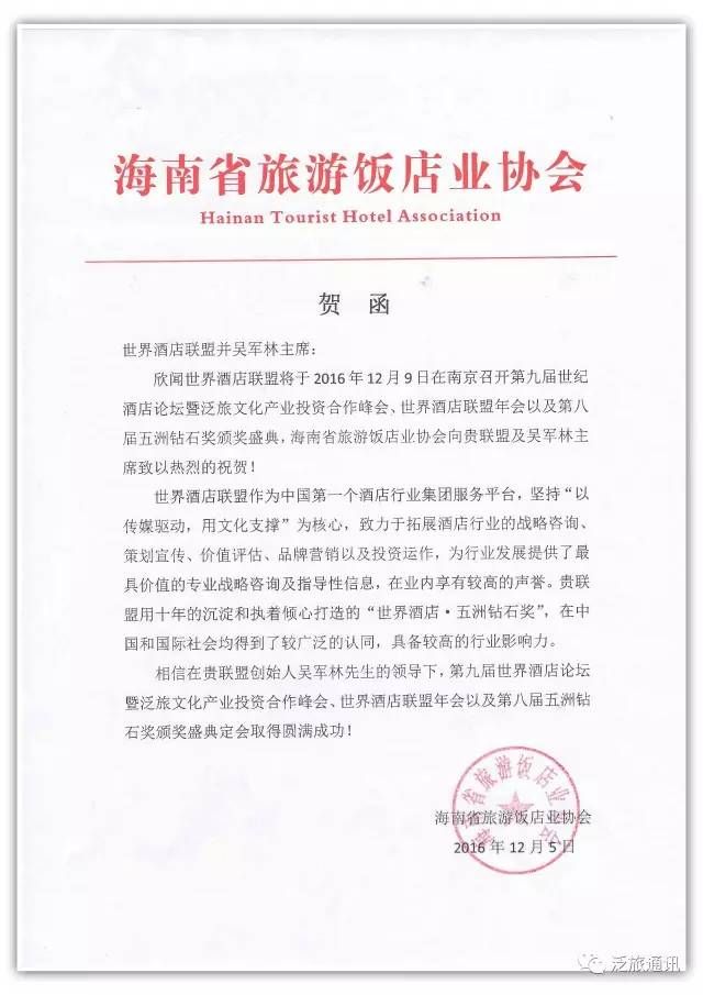 “第九屆世界酒店論壇大會暨泛旅文化產業投資合作峰會”將于2016年12月9-10日(8日報到)在南京東郊國賓館舉辦。
