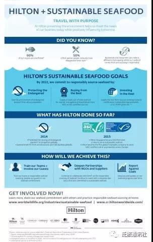 希爾頓可持續海洋食品目標包括:嚴禁采購世界野生動物基金會認定的瀕危物種,并從可持續和負責任的渠道采購海鮮。到2022年,希爾頓從經海洋管理委員會(MSC)認證的漁業企業和經水產養殖管理委員會(ASC)認證的農場所采購的產品至少將占到其全球海鮮采購總量的25%。希爾頓采購剩余海鮮的渠道將包括:正在努力獲取MSC和ASC認證的漁業公司和農場,綜合性漁業和水產品改善項目或那些在世界野生動物基金會區域海鮮指導目錄上標記為綠色的企業。世界野生動物基金會將幫助希爾頓衡量和報告進展,以確保公司能夠按照這一目標前行。希爾頓于2014年禁止在餐廳和餐飲場所銷售魚翅。2015年,希爾頓在歐洲和亞洲成為了業界第一家獲得MSC產銷監管鏈認證的酒店。在美洲,希爾頓還從Sysco這類致力于海鮮可持續發展舉措的供應商手中采購蝦產品。