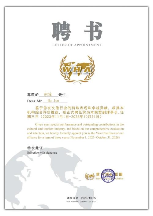 After research, it has been decided to appoint Ji Chong as the Vice Chairman of the World Hotel Alliance of the United Nations Department of Economic and Social Affairs for a term of three years. This is hereby announced.