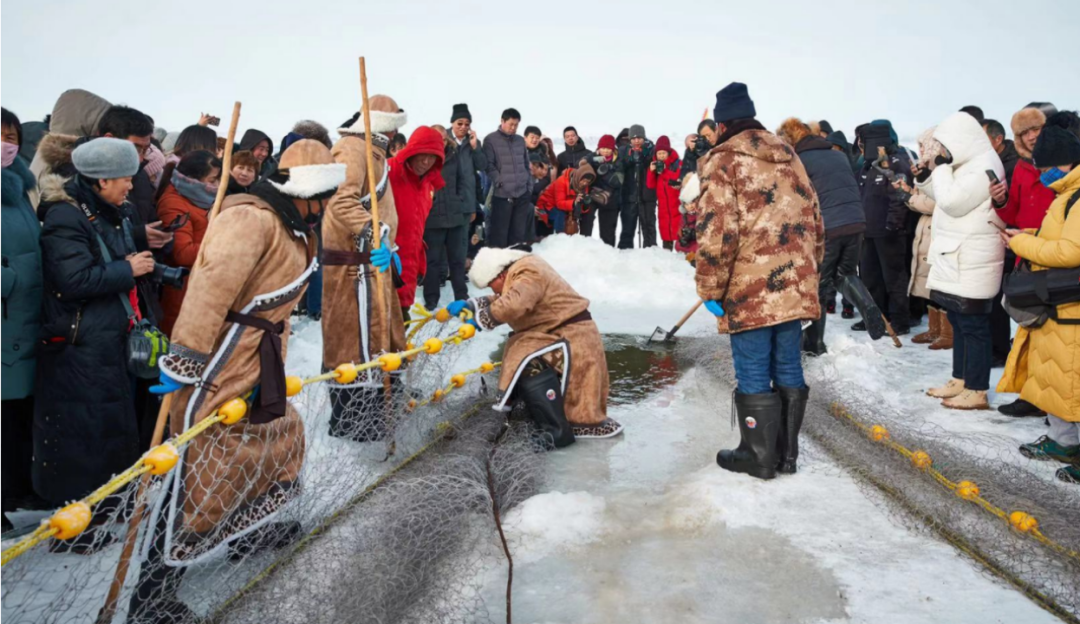 上千米的漁網從不到一平米的冰洞拉伸到數公里的范圍,在水底憑借著手感和馬力攤來成一個大圓,這是一個非常龐大的工程,漁網在水底走線時會遇到巨大的阻力,漁民們有著獨特的操作方法,下網口的兩邊每隔幾米會打一個網孔,放上絞盤,依靠馬力帶動絞盤旋轉,拖動漁網在水底前行,整個下網的時間從日出一直持續到中午,冬捕所有的工具、手藝、經驗全部都是先輩留下來的,人類體力和智慧的結合在此達到巔峰。