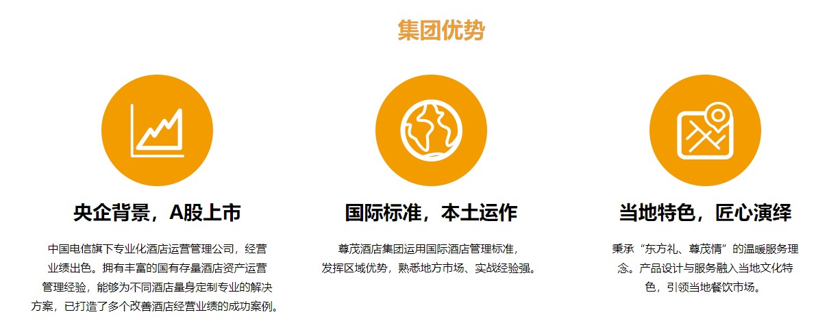 集團擁有豐富的國有存量酒店資產運營管理經驗,能夠為不同酒店量身定制專業的解決方案。同時能夠運用國際酒店管理標準,發揮區域優勢,幾年來我們以豐富的實戰經驗強打造了多個改善酒店經營業績的成功案例。所以我們把集團的優勢歸納為24個字:央企背景、A股上市;國際標準、本土運作;當地特色,匠心演繹。