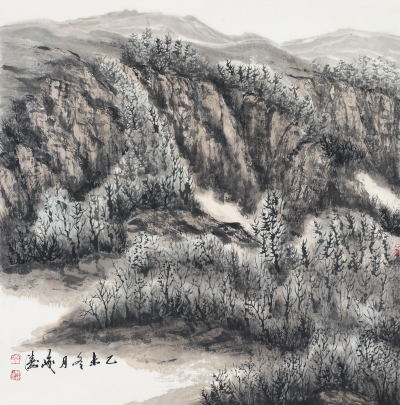 峻濤《生命高原》系列山水畫作品中,以一種現實主義筆法,冷靜敘述著高原的山山峁峁,深溝大壑,樹木蒿草,讓人進入一種厚重、雄渾、蒼涼、冷峻的意境。高原在他的筆下,顯然有著生命的質感與靈性,能感受到他與高原脈搏的律動,與高原情感的共振。那種生發于內心深處的體悟,訴說著生命的痛楚與歡樂,抗爭與頑強、憂郁與孤獨、冷寂與呼喚。這些其實都是對生命崇高美的贊頌,也是直面人生本質的深刻悟覺。